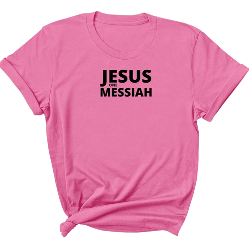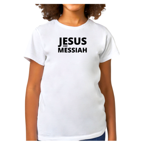 This T-shirt features a striking graphic print that showcases the message 'Jesus one Messiah'. The design is printed in the USA, ensuring high-quality printing standards. The bold graphic is perfect for expressing your faith and making a statement wherever you go. Whether you're wearing it to church, a casual gathering, or just out and about, this T-shirt is sure to turn heads and spark conversations.