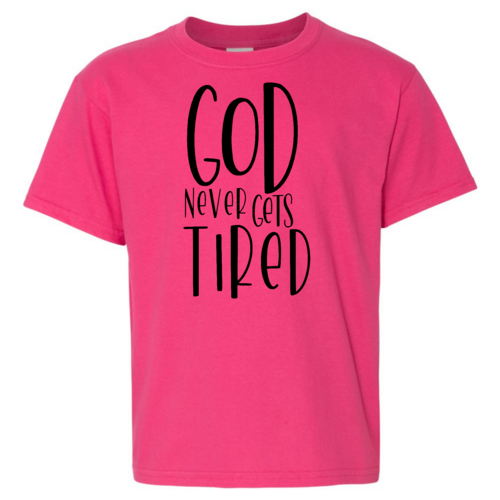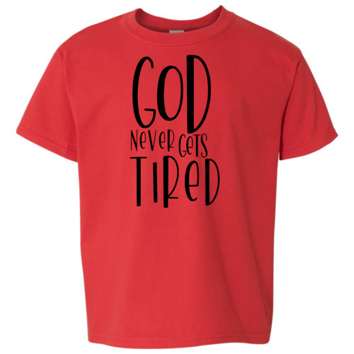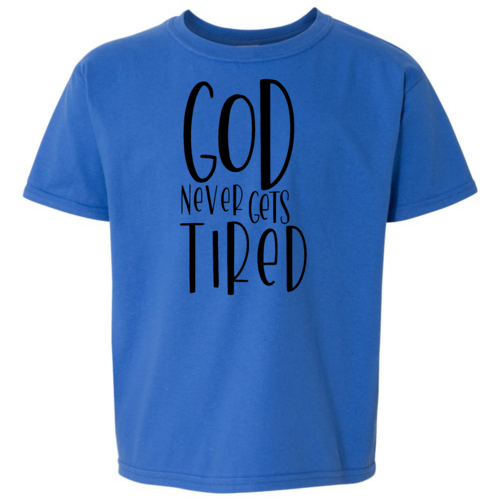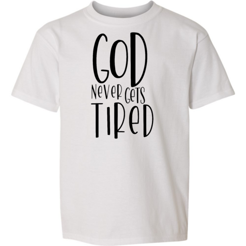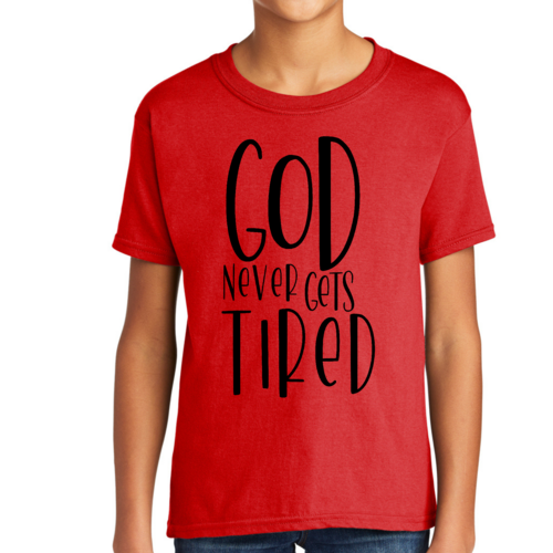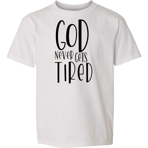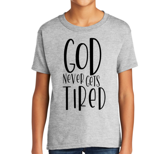 Introducing the Youth Short Sleeve Graphic T-shirt from Say It Soul, featuring the powerful and uplifting message 'God Never Gets Tired.' This T-shirt is not just a piece of clothing; it's a statement of faith and encouragement for young boys. Made from soft, preshrunk cotton, this shirt ensures comfort and durability, making it perfect for everyday wear.