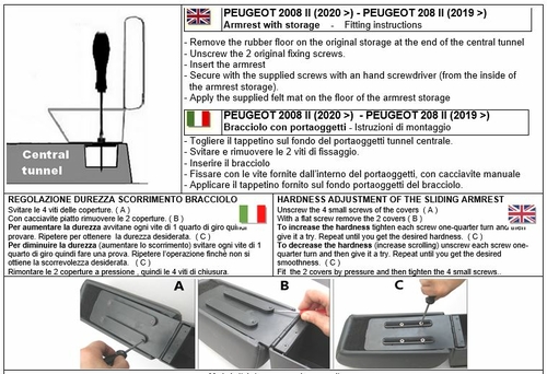 Specific armrest for Peugeot 208 (from 03/2019) and Peugeot 2008 (from 2020) equipped with a large storage compartment. The assembly is completely invisible (once installed no screws or brackets will be visible) making e armrest an integral part of the central tunnel.