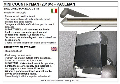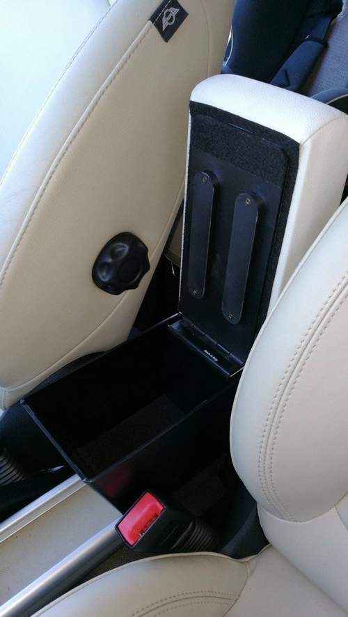 Specific armrest for Mini Countryman R60 equipped with a large storage compartment. The armrest is made and designed in Italy using only the best materials, with hand finishing performed by skilled artisans for over 25 years.
