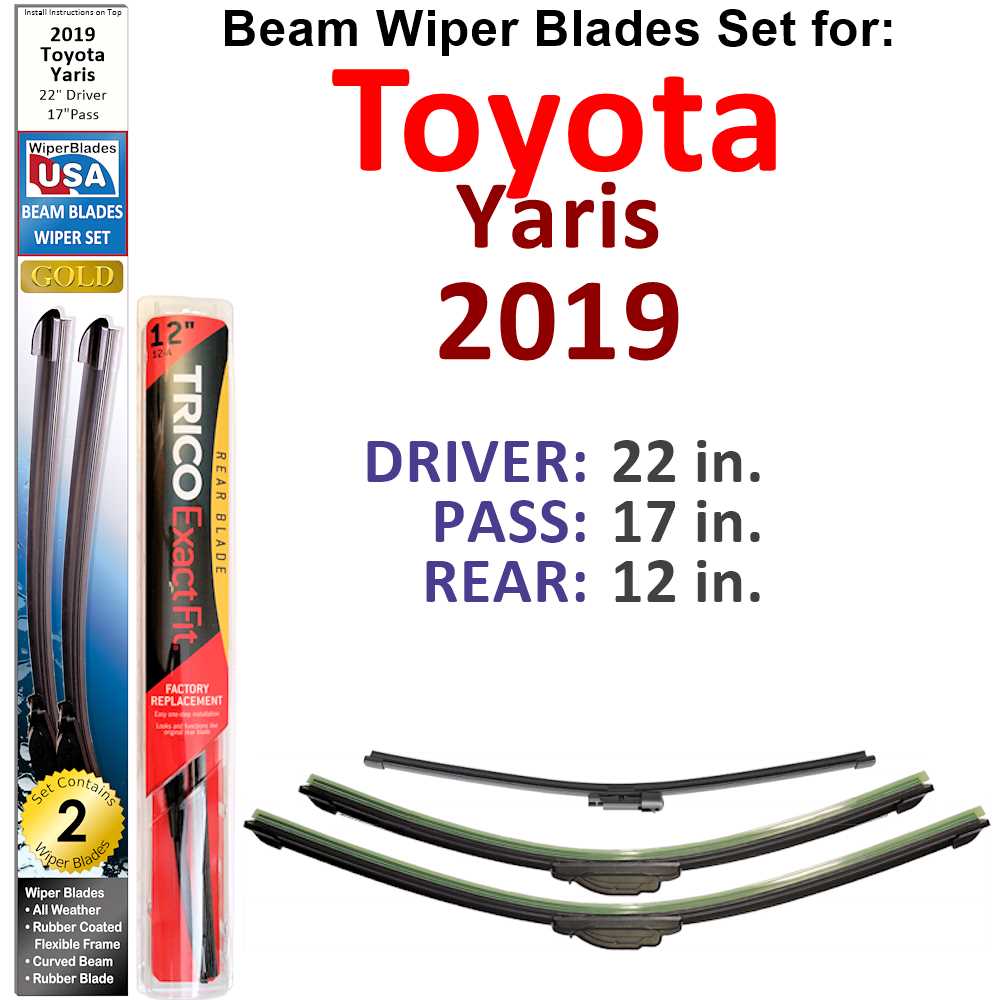 Experience unparalleled visibility and safety with our Low-Profile Quality Sealed Flexible Beam Wiper Blades, specifically designed for the 2019 Toyota Yaris. This set of three wiper blades includes a 22-inch driver blade, a 17-inch passenger blade, and a 12-inch rear blade, ensuring complete coverage for your vehicle's windshield.