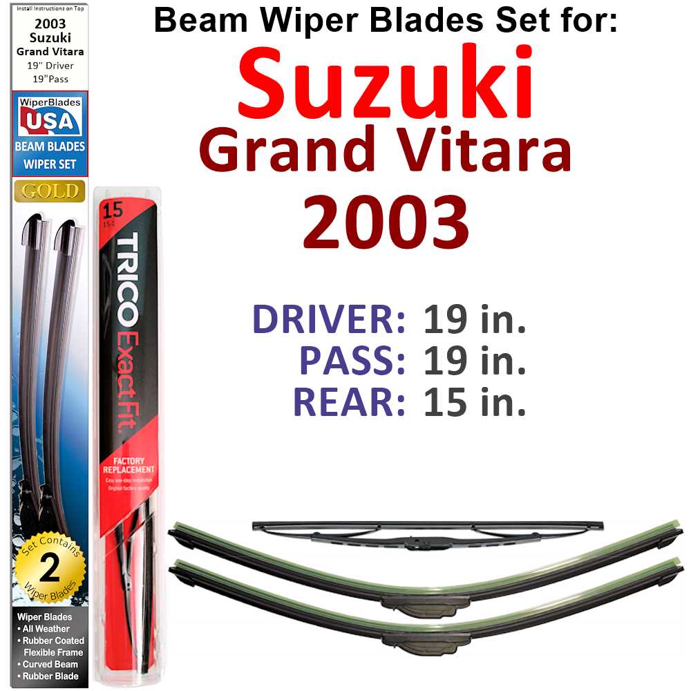 Introducing the Beam Wiper Blades specifically designed for the 2003 Suzuki Grand Vitara. This set of three wiper blades is engineered to provide superior visibility and performance, ensuring that you can drive safely in any weather condition. These custom assembled beam windshield wiper blades are guaranteed to fit your vehicle perfectly, making them an essential upgrade for your car.