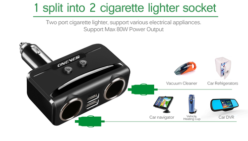 The car's original cigarette lighter socket can be split into 2 sockets by this one-to-two cigarette lighter, Max 80W power output, it can supply power for 2 devices at the same time such as GPS, DVR, car vacuum cleaner and other car electric appliances.