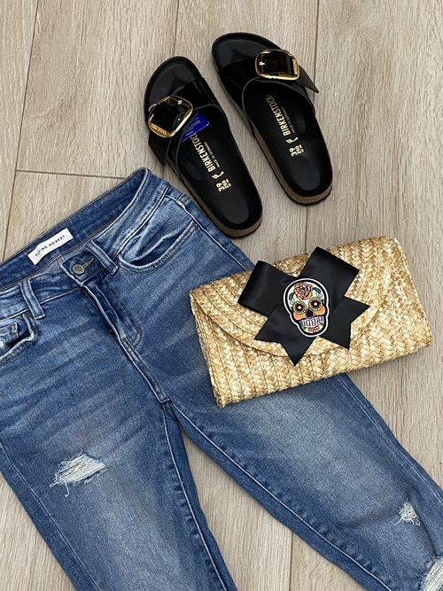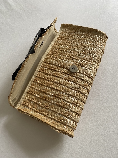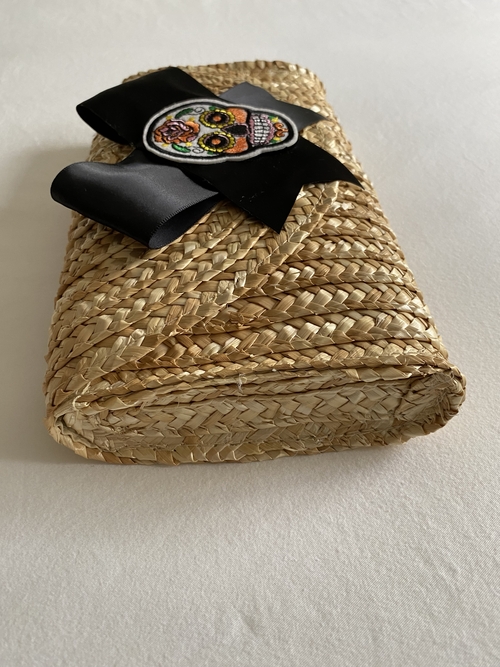 Handmade rattan straw clutch bag with black satin bow and sugar skull patch.
