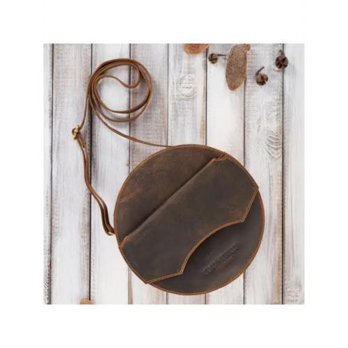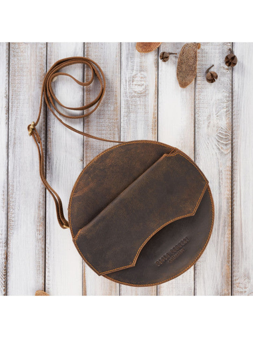 Indulge in the timeless elegance of our round leather handbag, a perfect blend of style and functionality. This exquisite handbag is meticulously crafted from aged natural hunter leather, which not only enhances its aesthetic appeal but also ensures durability. Each scratch and mark on the leather tells a unique story, adding to the bag's vintage allure and individuality. Whether you're heading to a casual outing or a formal event, this handbag is designed to complement any outfit.