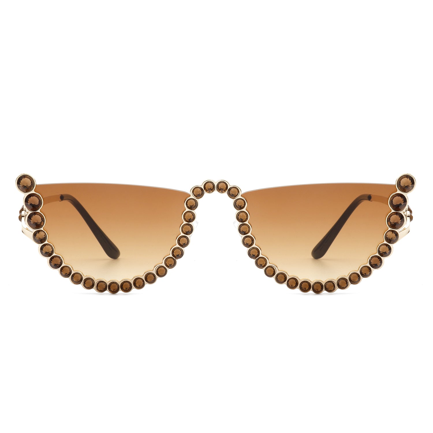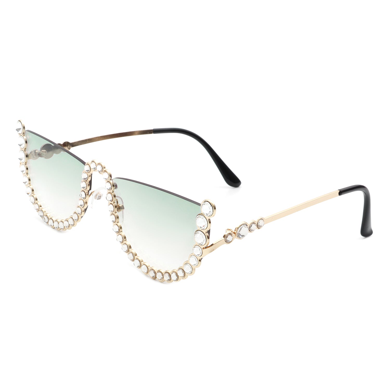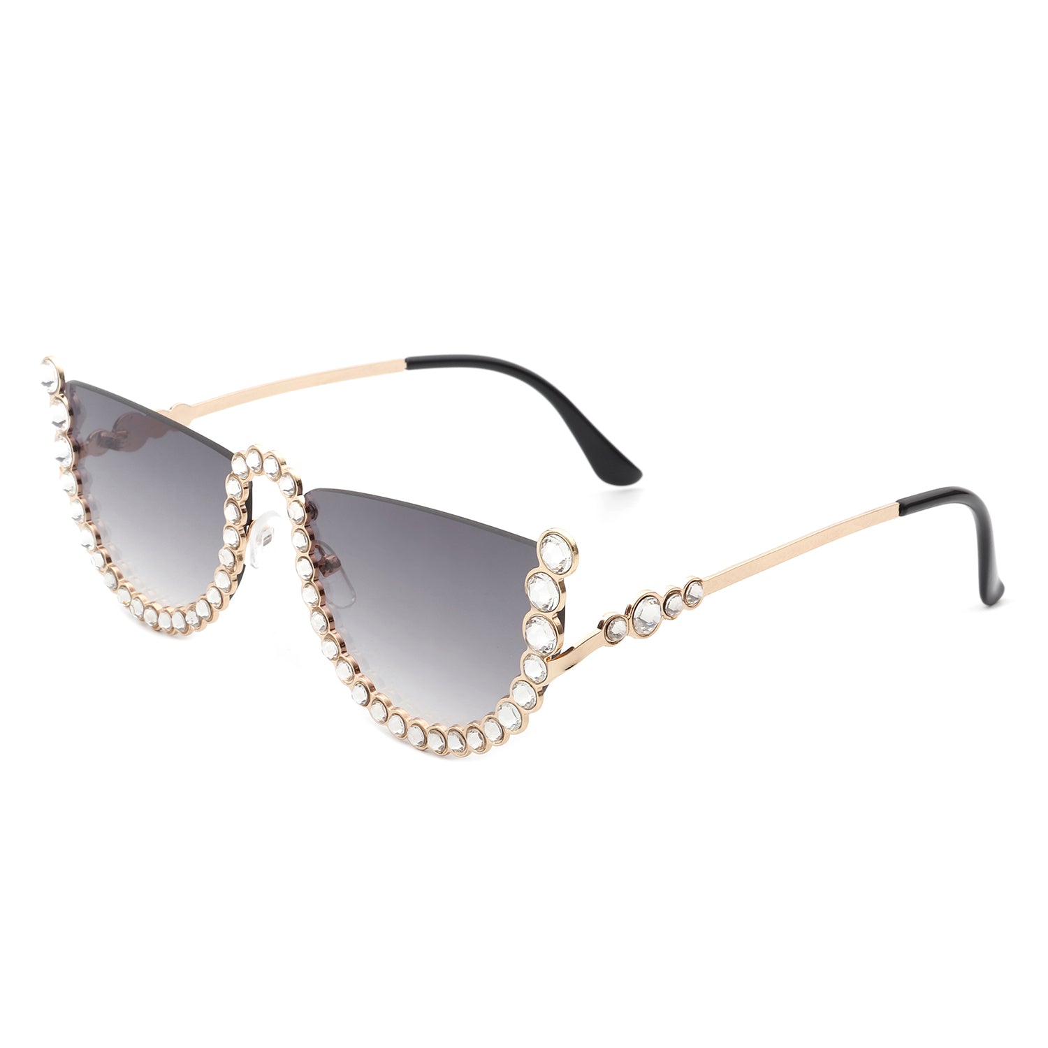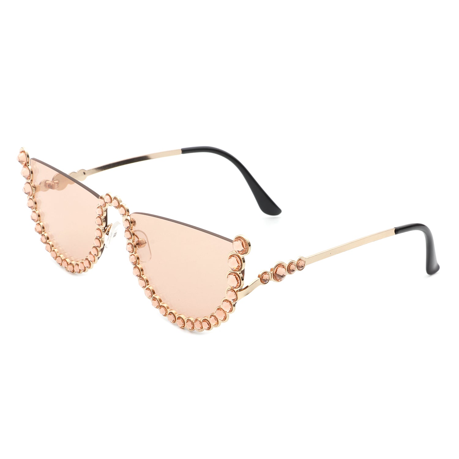 The Florinda sunglasses feature a unique half-frame design that combines elegance with modern flair. The round shape is flattering for various face shapes, making them a versatile choice for any outfit. The rhinestone embellishments add a touch of glamour, making these sunglasses perfect for both casual outings and special occasions.