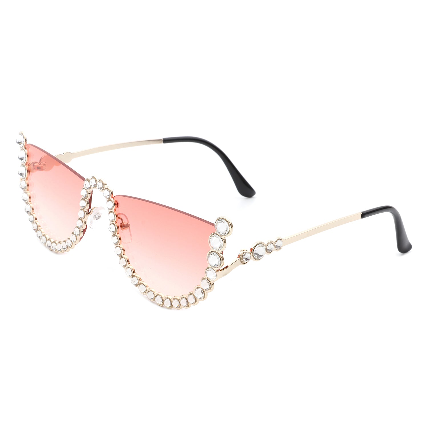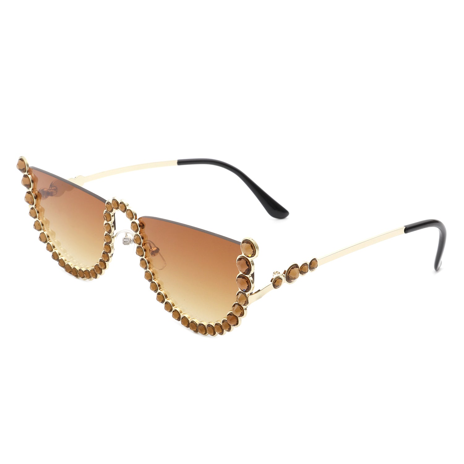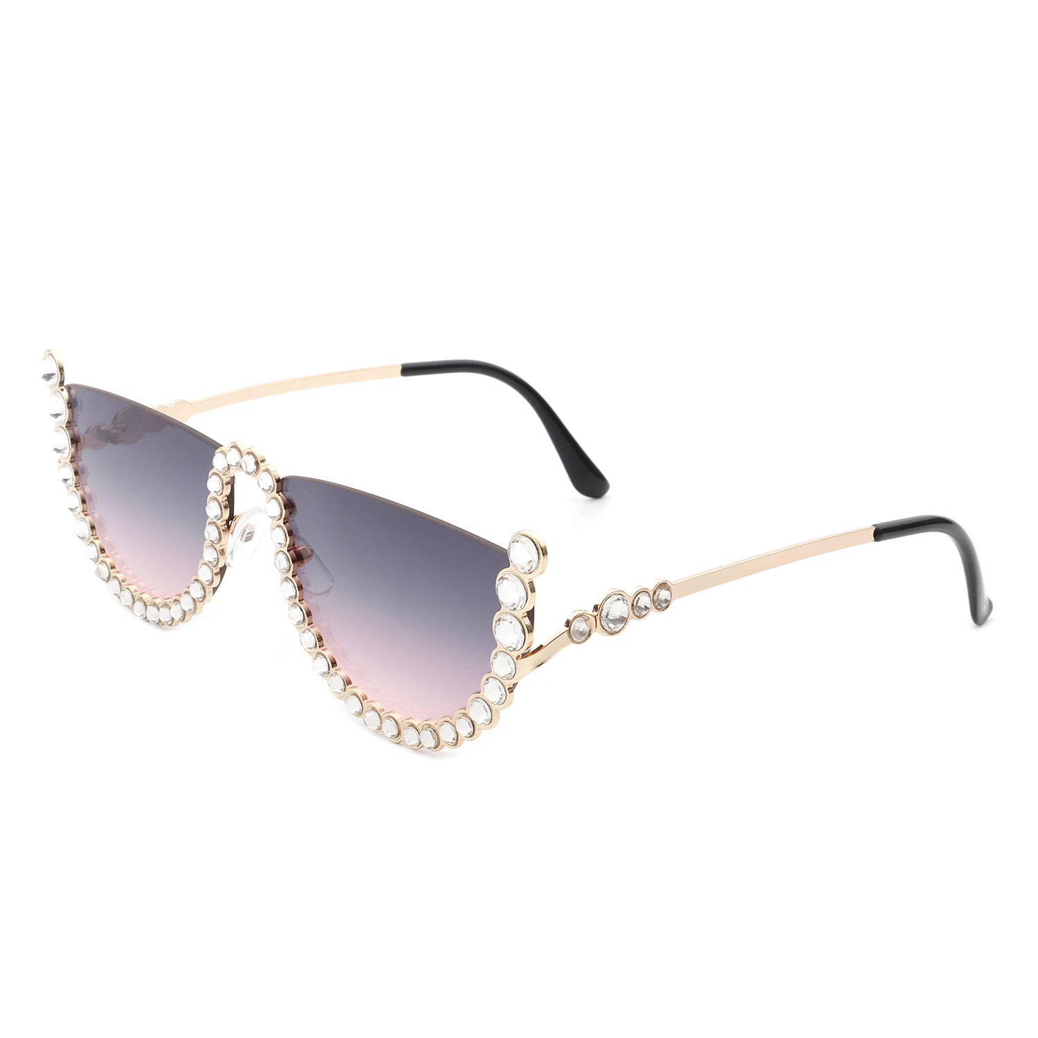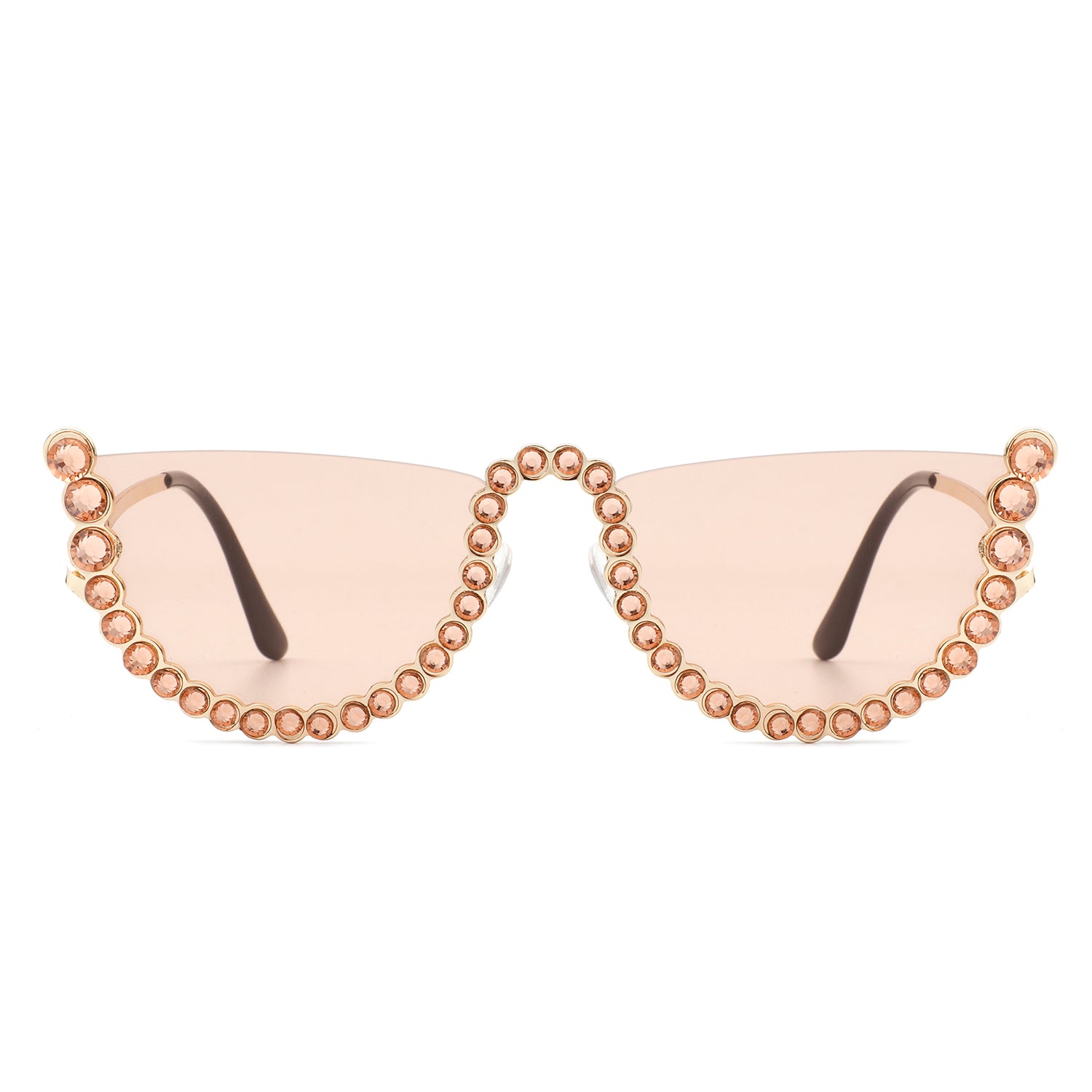 The Florinda sunglasses feature a unique half-frame design that combines elegance with modern flair. The round shape is flattering for various face shapes, making them a versatile choice for any outfit. The rhinestone embellishments add a touch of glamour, making these sunglasses perfect for both casual outings and special occasions.