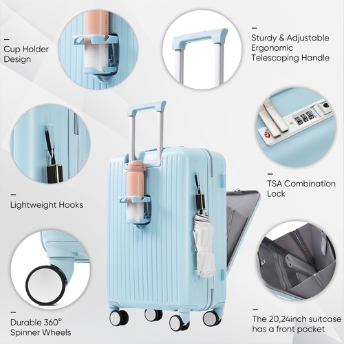 Smart Organization Features: From a hook for hanging bags to a convenient cup holder for your beverages, our suitcase set is packed with thoughtful features to enhance your travel experience. Stay organized and enjoy easy access to your essentials.
