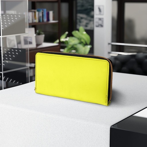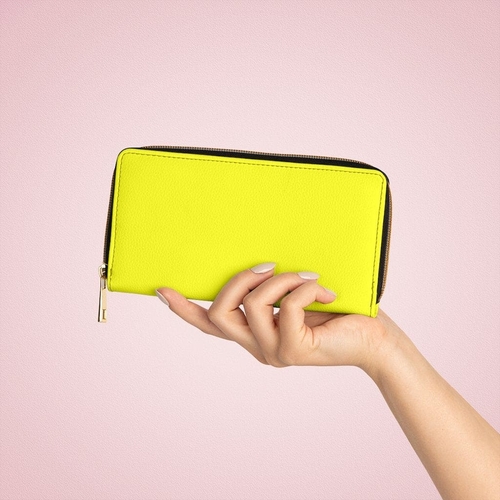 Introducing our Women's Wallet, Zip Purse in a vibrant bright yellow color, designed to combine style and functionality. This zippered wallet is perfect for carrying all your essentials, including credit cards, cash, and driver's licenses. With its eye-catching color and sleek design, this wallet is not just a practical accessory but also a fashion statement that complements any outfit.