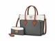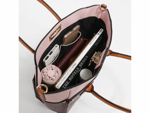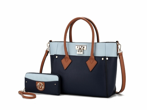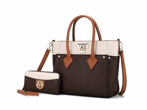 Our Brynlee Tote Bag is a softly structured style you will carry time and again. Crafted from high-quality vegan leather in a color-block finish and designed with gold-tone embellishment, this carryall is a one-compartment bag, spacious enough to hold your key items, making it the perfect everyday piece. A flip-lock closure opens to reveal a fully lined well-organized interior with two slip pockets and a wall zip pocket. Carry it on your shoulder by the smooth top handles or attach the adjustable crossbody strap to expand however long you desire and go hands-free. This style has a flat base and feet for stability. The Brynlee Tote bag comes with a matching Wallet. You will love this everyday bag.