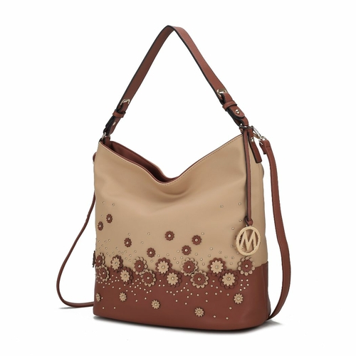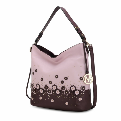 Crafted from smooth vegan leather and a beautiful 3-D color block floral design with studs, you will love our statement-making Dione Shoulder bag. Rendered in a streamlined silhouette, this carryall features a detachable and adjustable shoulder strap for everyday versatility. Designed with gold-tone embellishments, the Dione Shoulder Bag unzips to reveal a fully lined interior with slip pockets and a wall zippered pocket. It comes with our signature circle emblem. It has a convenient exterior back zipper pocket.