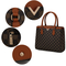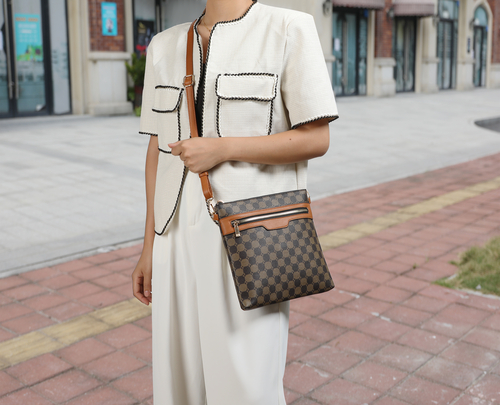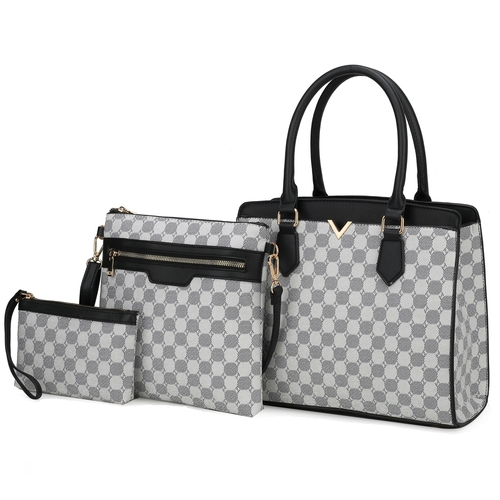 Our Finnley Satchel Bag combines style and elegance. Rendered in a printed pattern with details in a smooth high-quality vegan leather trim, this bag has two spacious compartments designed to stow all you need for a busy day. Unzips the bag to reveal a printed lined interior with a wall zippered pocket and slip pockets for all your daily essentials. Designed with gold-tone embellishments, the Finnley Satchel Bag has a structured silhouette with a flat base for stability and protective metal feet. It comes with a matching wristlet and a matching crossbody bag. The Finnley Satchel is the perfect companion for any outing with an array of organizational features and timeless style.