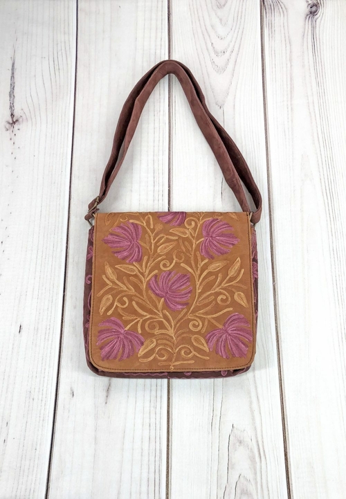 Dropship Handmade Beige and Mauve Suede Embroidered Messenger Bag