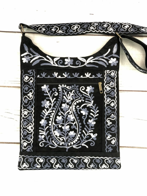 Functional and trendy cross-body bag with vibrant floral pattern. Embroidery on both sides. Lining inside, zip cell phone pocket inside, one main zip closure, two full-face pockets on both sides, adjustable suede strap.