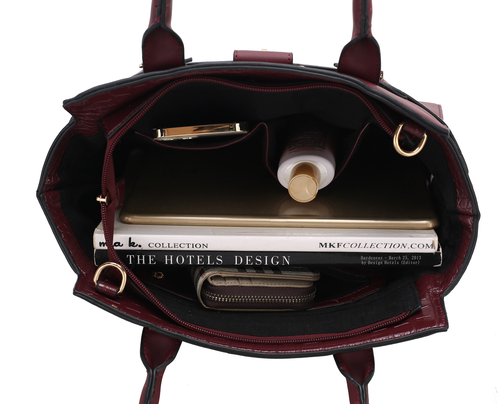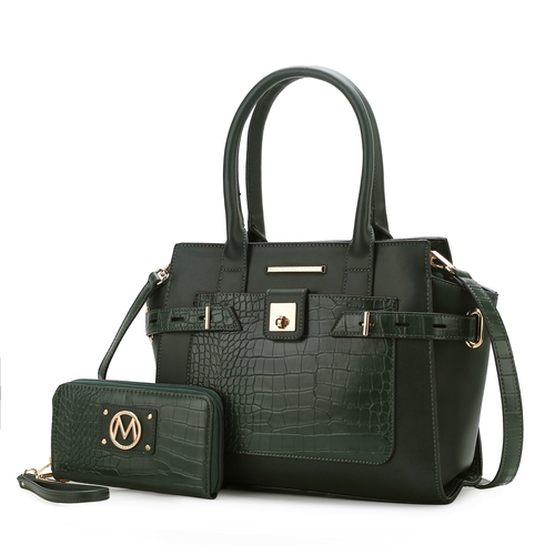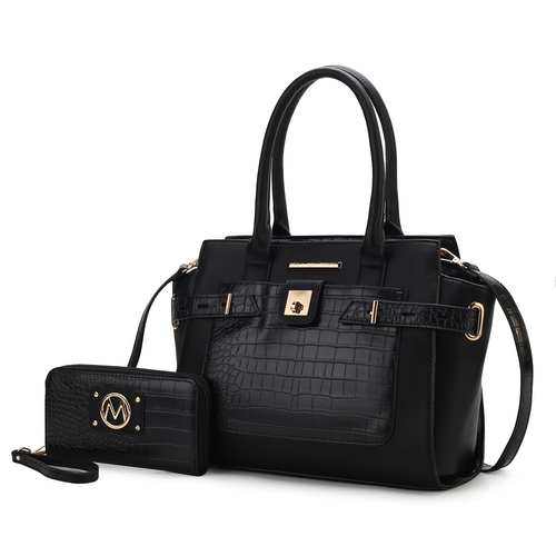 A pragmatic yet statement-making accessory, our Isla Satchel is an instant icon. Crafted from luxe vegan leather matching with a front pocket and a side belt crocodile-embossed vegan leather, you will love this style to create a polished look. Designed with gold-tone embellishments, unzips it to reveal a fully lined interior with two slip pockets and a wall zippered pocket. Carry it by the top round handles or attach the adjustable strap to style it crossbody. It has a convenient exterior front slip pocket with a turn-lock and a back zippered pocket to stow your small belongings. The Isla Satchel Bag has a flat base with feet for stability, and it comes with a matching wallet.