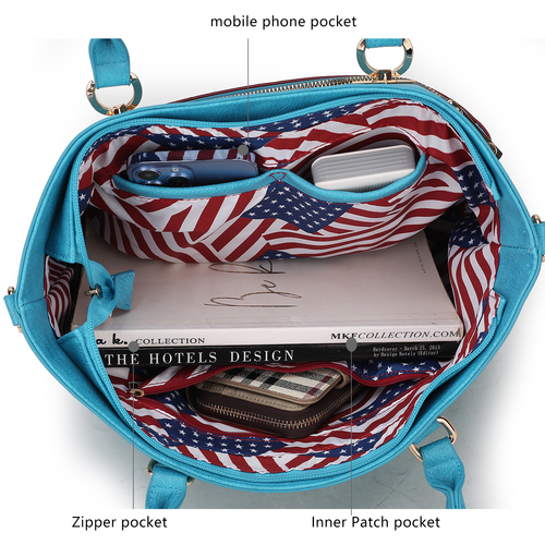 Our Lilian carryall is the ultimate tote bag for everyday wear. Rendered in a printed patriotic pattern in high-quality vegan leather, this one-compartment bag is designed to stow all you need for a busy day. Unzips the bag to reveal a printed lined interior with a wall zippered pocket and slip pockets for all your daily essentials. Designed with gold-tone embellishments, the Lilian Tote Bag has a softly structured silhouette with a flat base for stability and protective metal feet. Carry it by the smooth top handles or if the mood strikes, attach the adjustable crossbody strap The Lilian Tote Bag is the perfect companion for any outing with an array of organizational features.