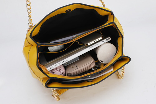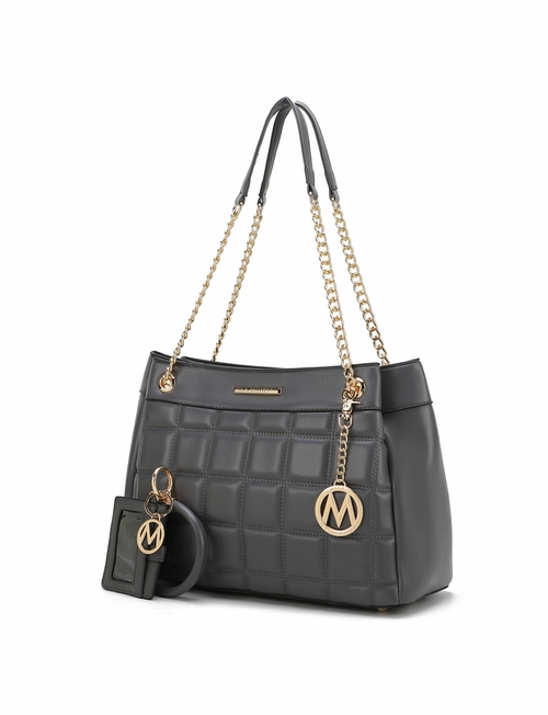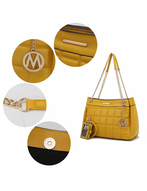 Our Mabel Bag is a chic style for everyday wear. Crafted from high-quality smooth vegan leather, this handbag features a puffy quilted pattern and gold-tone embellishments for tactile glamour. The Mabel Shoulder handbag comes with triple compartments along with interior pockets to offer plenty of space for your cosmetics, phone and other belongings. The main compartment has a zipper closure while the other two compartments have snap buttons to help keep the contents secure. It features a chain-link strap for an ultra-luxe finish. The Mabel Shoulder bag comes with a detachable keychain with our round M emblem for decoration. This style has a flat base and feet for stability. It comes with a matching Bracelet Keychain with a credit card holder. The polished Bracelet comes with a quick release clip, which allows you to add or remove your keys easily. It has a zip pocket closure where you can keep cash in it and 4 card slot The Mabel Shoulder is an endlessly versatile style.