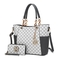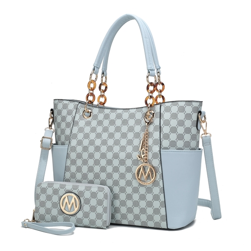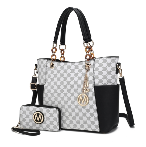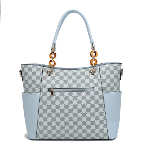 A classic silhouette, this everyday Merlina Tote Bag is crafted from high-quality vegan leather with a statement circular print, matching with colorful trim, handles, and strap. Designed with gold-tone embellishments, the Merlina Tote Bag unzips to reveal a fully lined interior with slip pockets and a wall zippered pocket. The exterior features a convenient back zippered pocket and a slip pocket on each side. Carry it by the smooth top handles with the beautiful detail of the resin chain or if the mood strikes, attach the adjustable crossbody strap. The Merlina Tote bag has a flat base and metal feet to keep the bag in an upright position. The Merlina Tote bag comes with a matching wallet.