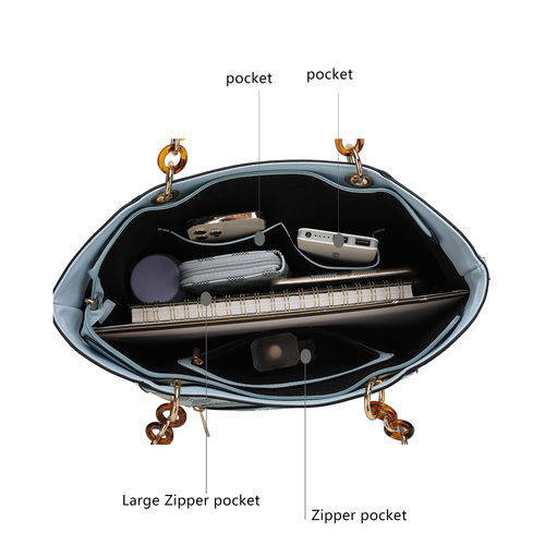 POCKETS: The tote bag Interior features a wall zip pocket and two slip pockets. The exterior features one zippered back pocket and a slip pocket on each side