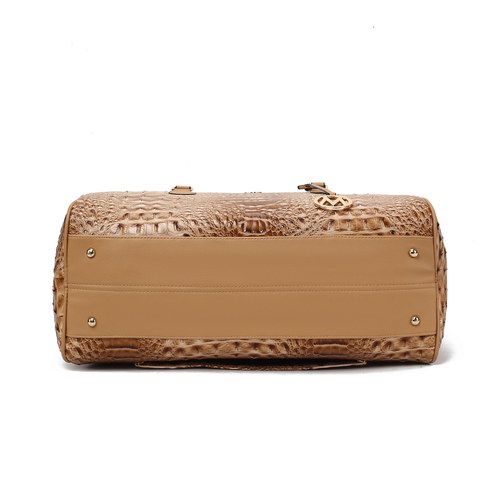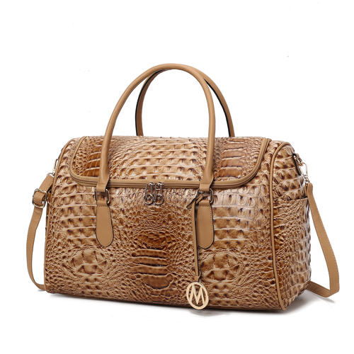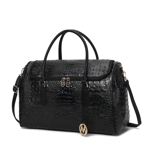 Rina Crocodile Embossed Duffle Bag - a luxurious fusion of style and functionality. Crafted from high-quality embossed crocodile-patterned vegan leather, this bag showcases a refined and modern aesthetic. Smooth handles and an adjustable crossbody strap offer comfort and versatility. Side magnetic snap pockets and a trolley sleeve provide quick access and convenience. A flat base with protective metal feet ensures durability, while the double zipper closure opens to a fully lined interior with ample storage. Interior features a wall zip pocket and two slip pockets, while the exterior boasts side magnetic snap pockets and a trolley sleeve with a zipper pocket compartment.