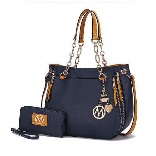 Exterior features back zippered pocket, 2 front spacious zippered pockets, and 2 more decorative front zippered pockets