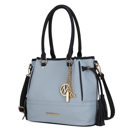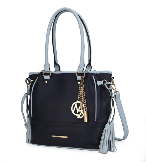 Designed in a soft yet structured silhouette, our Moira Tote Bag is crafted from high-quality two-tone pebbled vegan leather and designed with gold-tone embellishments. Unzips The Moira Tote Bag to reveal a fully lined interior with slip pockets and a wall zippered pocket. The exterior has a convenient back zip pocket to keep your small belongings. Carry it by the smooth top handles or if the mood strikes, attach the adjustable crossbody strap. The Moira Bag has two beautiful tassels on each side and our signature Mia K. Collection metal plate emblem on the front for decoration. The Moira Tote Bag has a flat base and feet for stability.