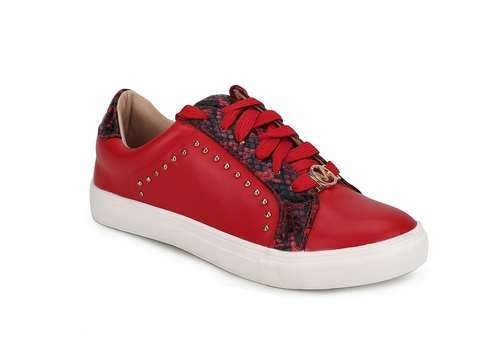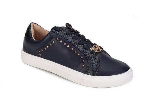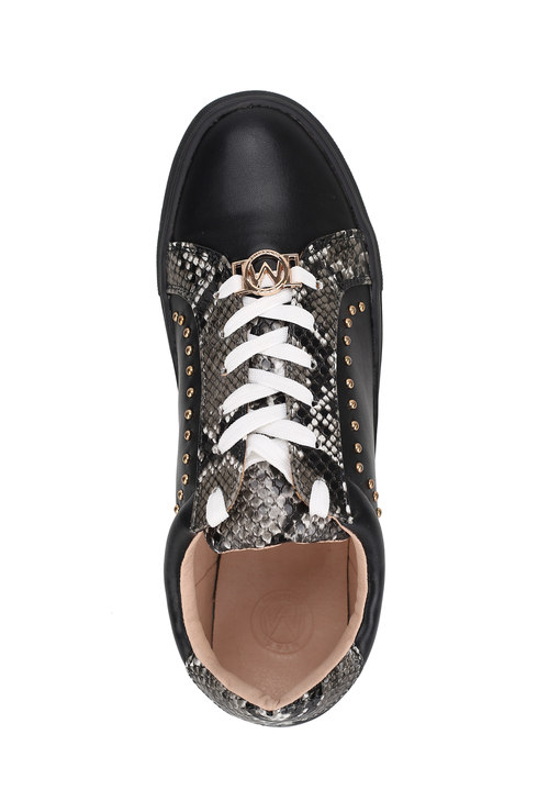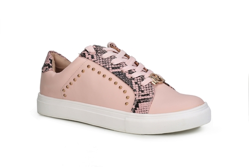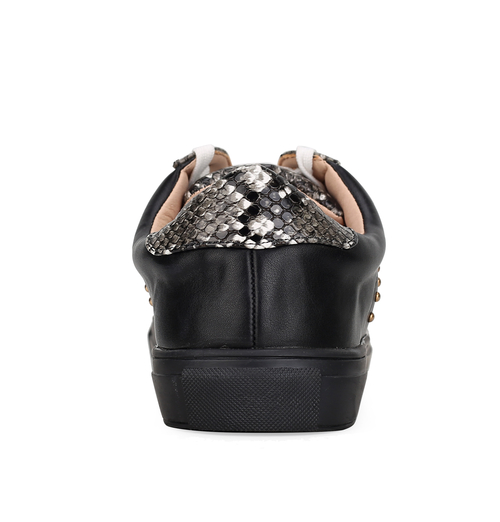 • Casual-cool style gets reimagined with our low-top Tamara Sneakers. Meticulously crafted from vegan leather and phyton-embossed accents and high-shine studs, these sneakers provide styling versatility for seasons to come. The Tamara Sneaker comes with a decorative signature circle emblem on the front. The sneakers are set on flexible rubber soler for day-long comfort.