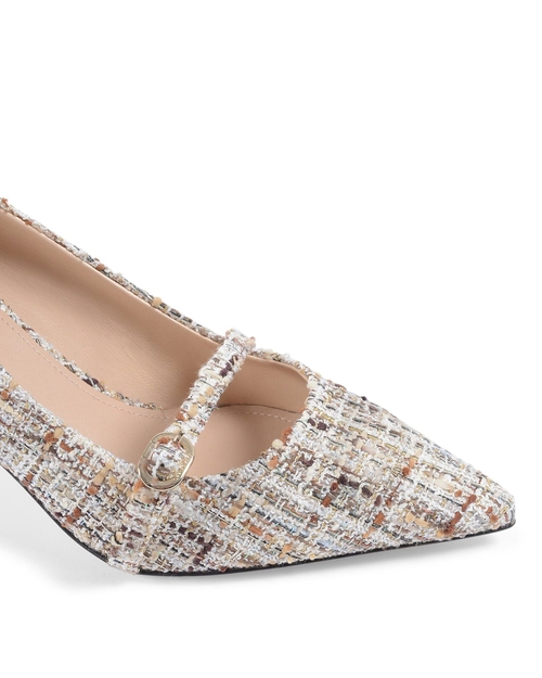 This boucl?© fabric mary-jane pump with matching strap will make your days sparkling and special. Made by the best Italian artisans, this shoe has a comfortable 5 cm heel for all occasions