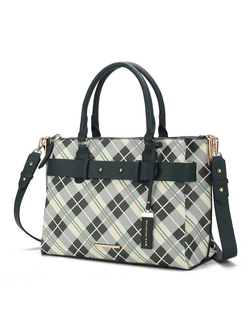 Upgrade your style with the Vivian Plaid Pattern Satchel Handbag, a chic blend of timeless elegance and contemporary design. Crafted from premium faux leather, its striking plaid pattern pairs beautifully with smooth trims, exuding sophistication and class. Accented by luxurious gold-tone hardware and decorative belt detail, this bag delivers a subtle touch of glamour. Choose your carry style with top handles or the detachable, adjustable wide shoulder strap. The spacious, well-organized interior features multiple compartments, including two slip pockets and a wall zip pocket, perfect for effortless organization. A secure zip-top closure ensures belongings stay safe.