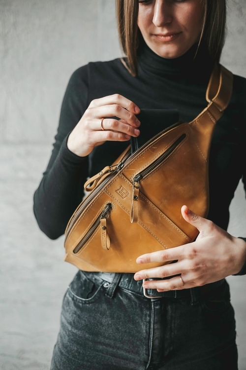 - Reassuringly authentic real leather banana bag - Available in a range of colors Fanny packs are an absolute dream for casual errands, shopping and even going to festivals. But why are they so poorly made? Our fanny packs - like all our products- are handcrafted from only the finest quality soft leather so it is convenient when running errands but also tough enough to survive that festival or jungle expedition you are considering! Features: • 1 zippered general compartment • 2 or 1 zippered front pockets • 1 inner pocket inside • Adjustable shoulder strap • Various colours available • 100% genuine leather • Sustainably handmade Dimensions: - Large with 2 Front Pockets: 16.14" x 8.67" (41 x 22 centimetrs) - Small with 1 Front Pocket: 12.2" x 4.72" (31 x 12 centimetrs) Unique touch: If you are hunting for something that will help you to stand out from the rest, show your individuality or make an unforgettable impression, personalization will be the very thing! Laser engraving provides thousands of possibilities to make your item different from lots of others, so let us know how you'd like this wallet to be personalized! **As with all our products, you can trust this is 100% handmade from authentic, durable leather.** For our full range of authentic leather goods, please see our shop here: If you have any question, let me know :-) Marta.