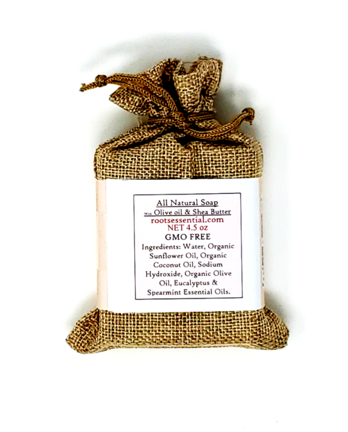 Scrub away impurities Roots Essential way! Our Eucalyptus-Speamint All Natural Soap combo has strong and invigorating aroma. It's non drying, moisturizing, and GMO FREE. Comes with a 100% natural plant fiber mesh scrub for deep yet gentle clean, leaving your skin fresh & young-looking