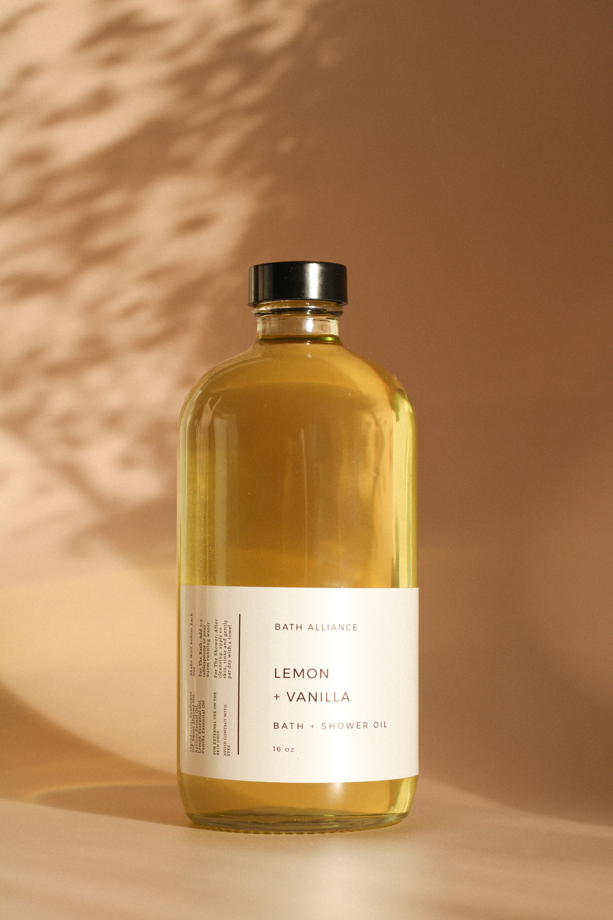 A 16 oz glass bottle of Lemon + Vanilla Bath + Shower Oil with a bright yellow label, showcasing its nourishing ingredients and refreshing aroma.