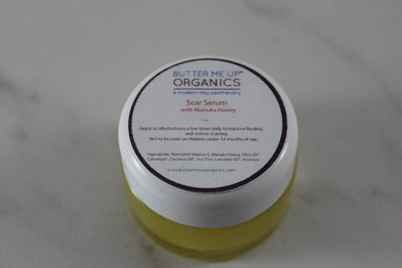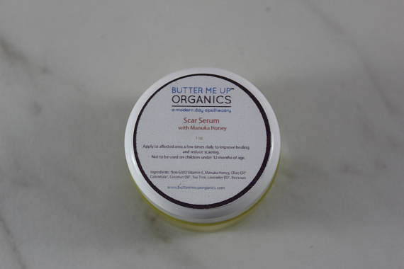 A bottle of Scar Serum featuring a blend of natural ingredients like Manuka Honey and Vitamin E, designed to reduce the appearance of scars.