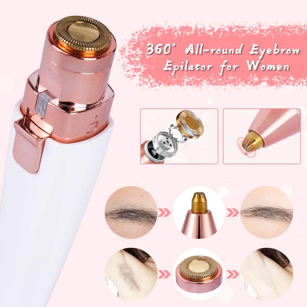 2 in 1 Electric Eyebrow Trimmer with stainless steel blades and LED light, designed for painless hair removal for women.