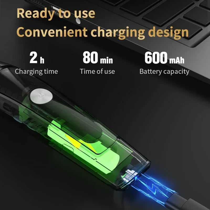 Measuring 16.2 * 3.9 * 4cm, this hair clipper is designed for easy handling and maneuverability. The stainless steel blades ensure a clean and smooth cut, while the device's ergonomic design allows for comfortable use. The clipper requires a charging time of just 2 hours, providing up to 80 minutes of continuous usage, making it perfect for quick touch-ups or full grooming sessions.