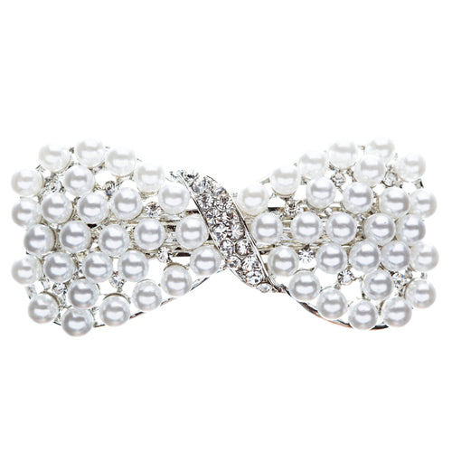 Elegant bridal hair barrette featuring a stunning ribbon bow design adorned with clear crystal rhinestones and white faux pearls.