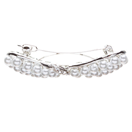 The hair barrette is crafted from clear crystal rhinestones that catch the light beautifully, adding a sparkling effect to your hair. The white faux pearls complement the crystals perfectly, creating a harmonious blend of textures and colors. The metal casting is rhodium plated, ensuring that the barrette is not only stunning but also durable and resistant to tarnishing. This means you can cherish this piece for years to come, whether you choose to wear it on your wedding day or for special occasions thereafter.