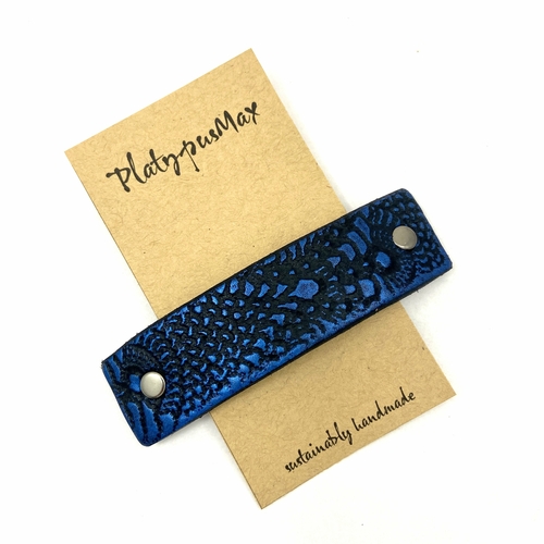 Cobalt blue and black lace texture leather hair barrette, showcasing its unique design and craftsmanship.