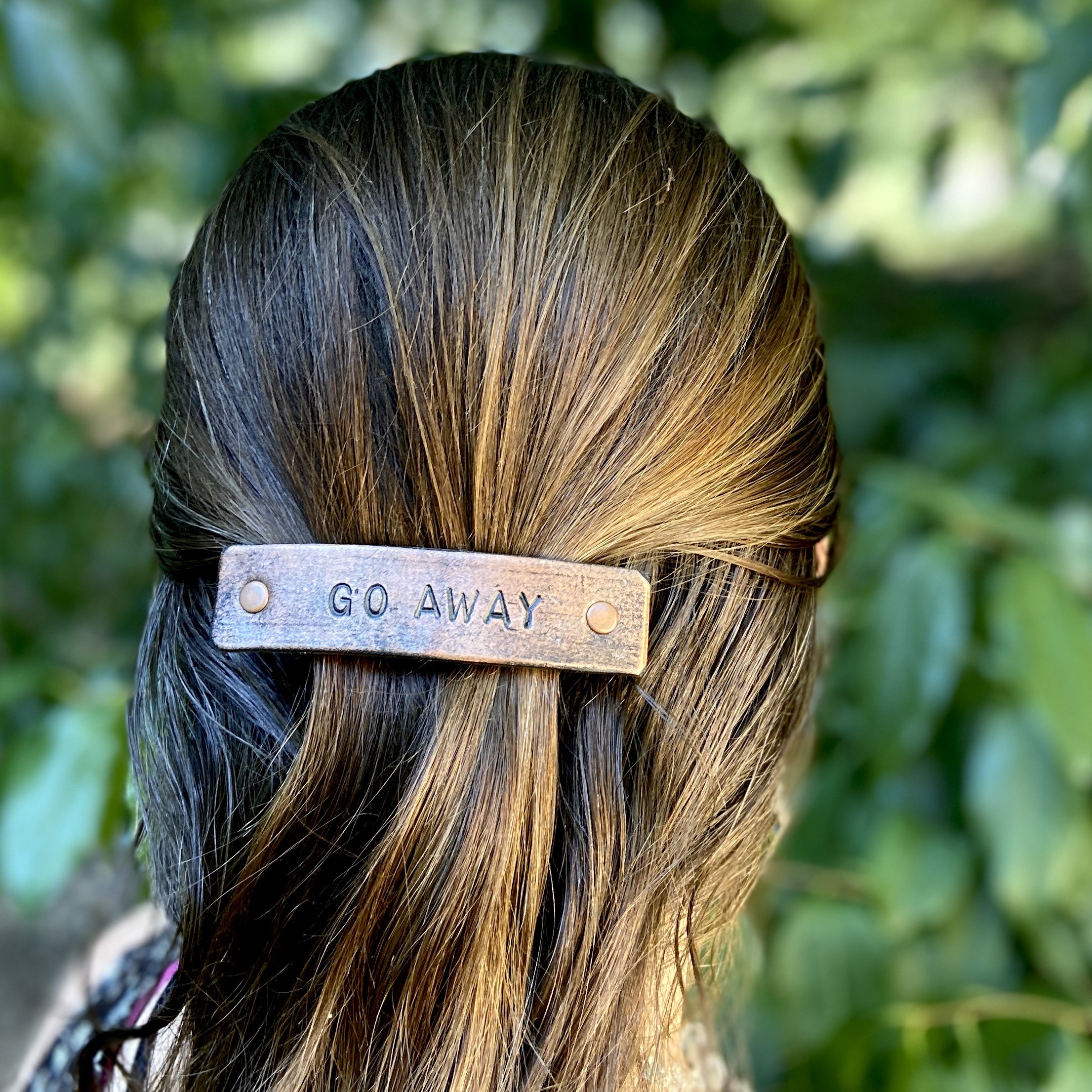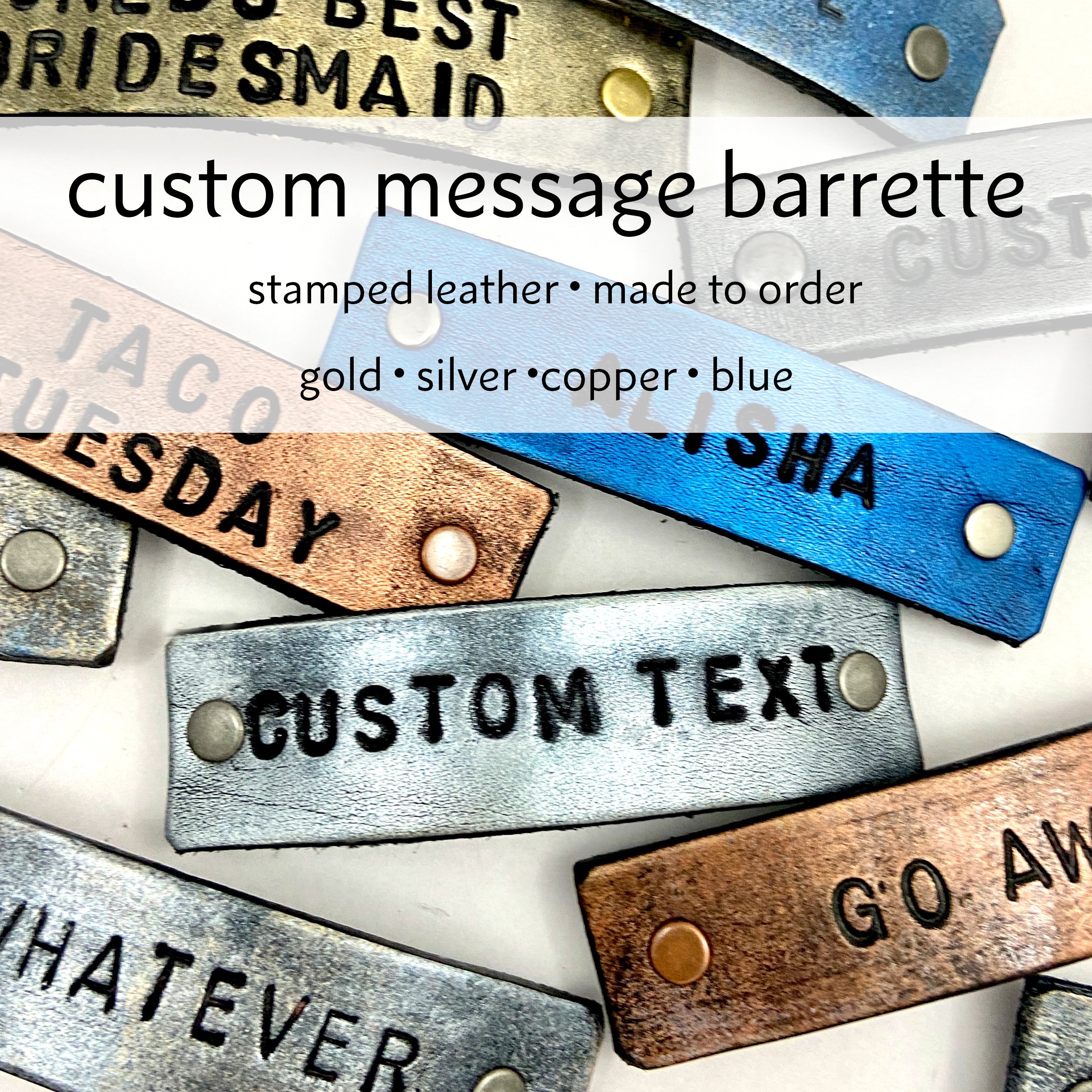 Introducing our Custom Text Message / Stamped Words, Name, ZIP Code Leather Barrette, a unique accessory that allows you to express your personality in a stylish way. This handmade leather barrette is perfect for anyone looking to add a personal touch to their hair accessories. With the ability to customize your message, you can showcase your individuality or send a fun message to the world.