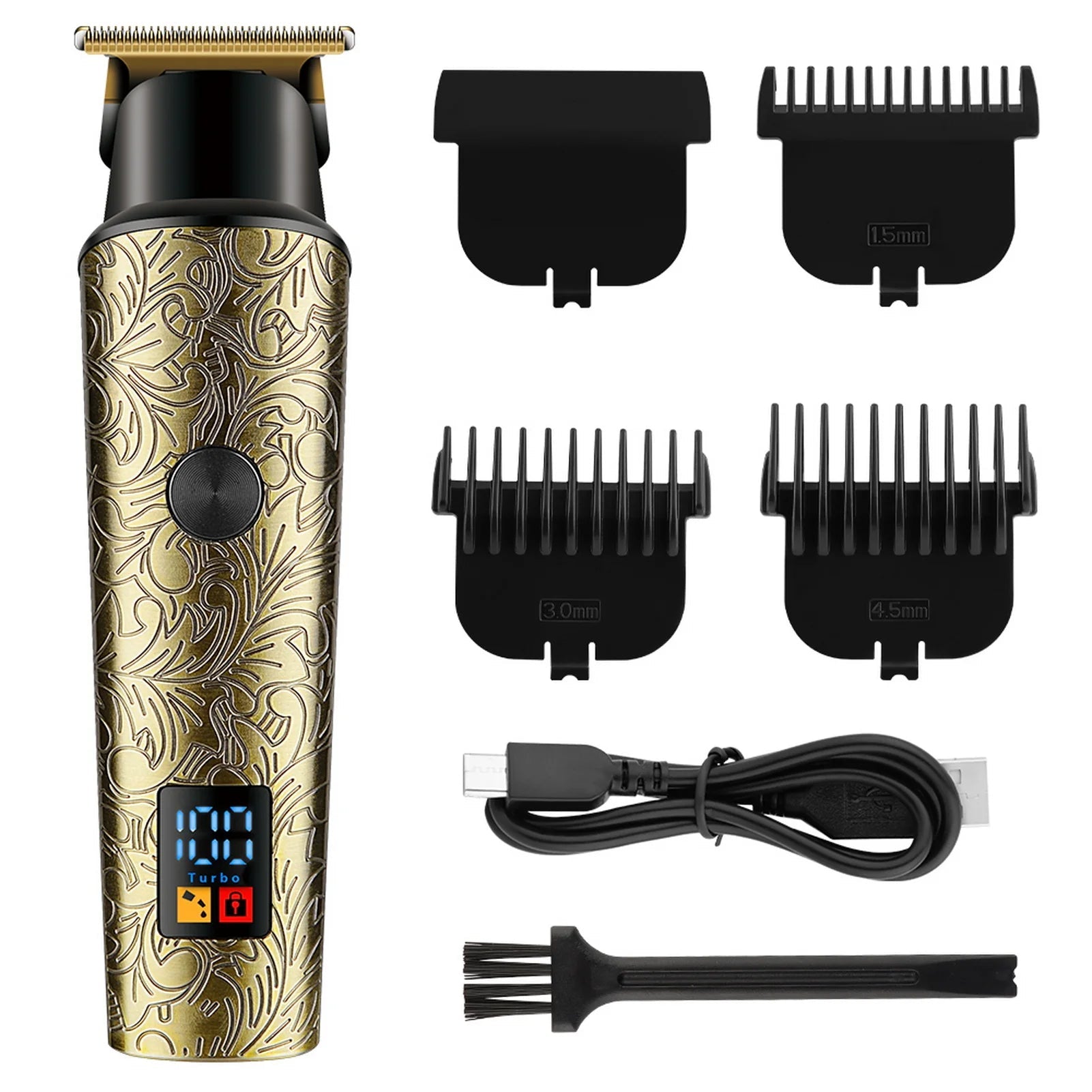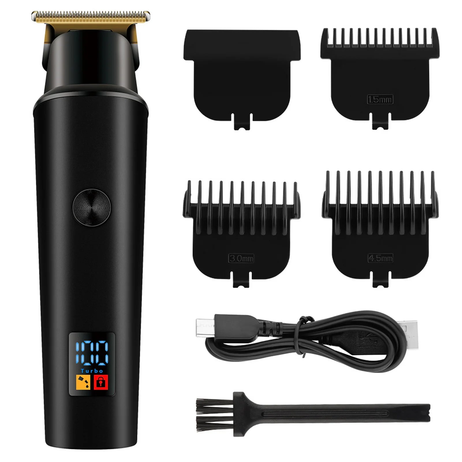 Professional cordless hair clippers set for men with accessories including combs and USB cable, designed for precise grooming.