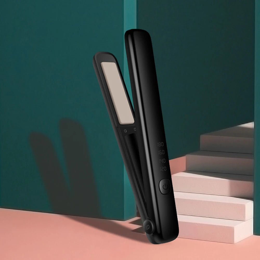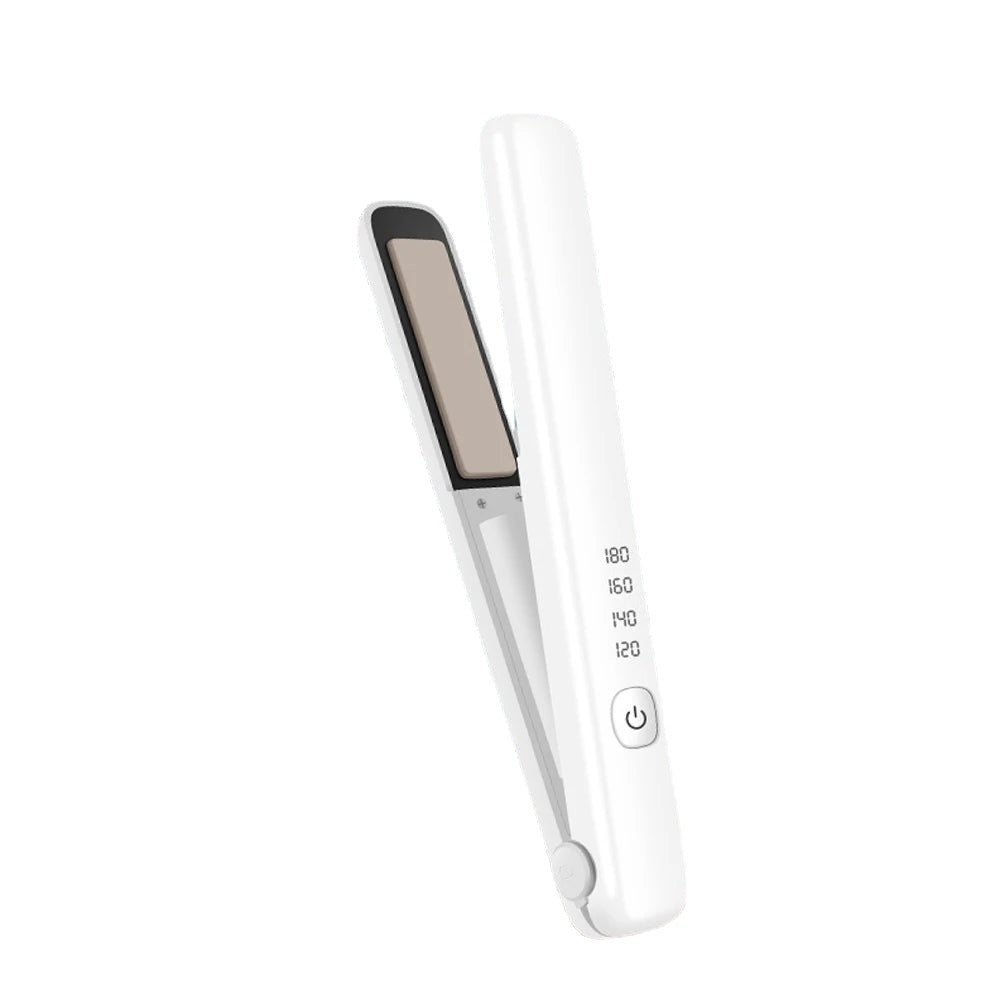Cordless ceramic hair straightener with floating plates and USB charging, showcasing its sleek design and digital display.