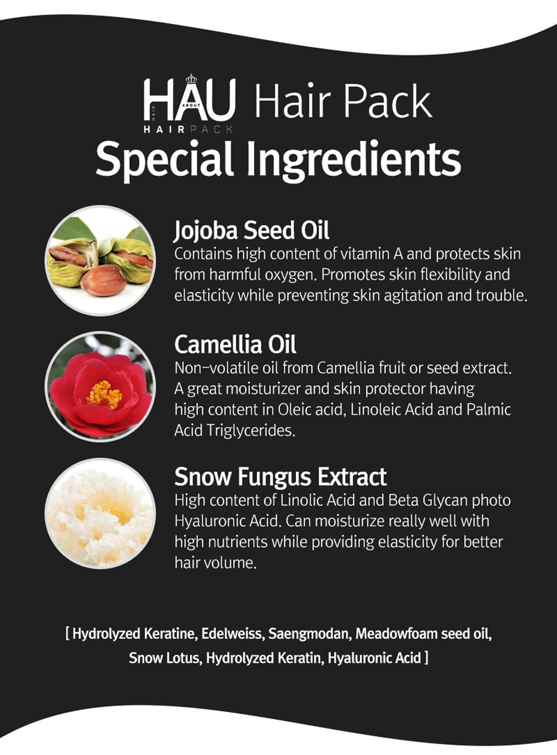 The HAU Professional Hair Pack is formulated with a blend of high-quality ingredients that work synergistically to restore and rejuvenate your hair. Key ingredients include: