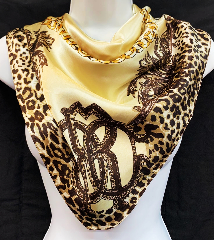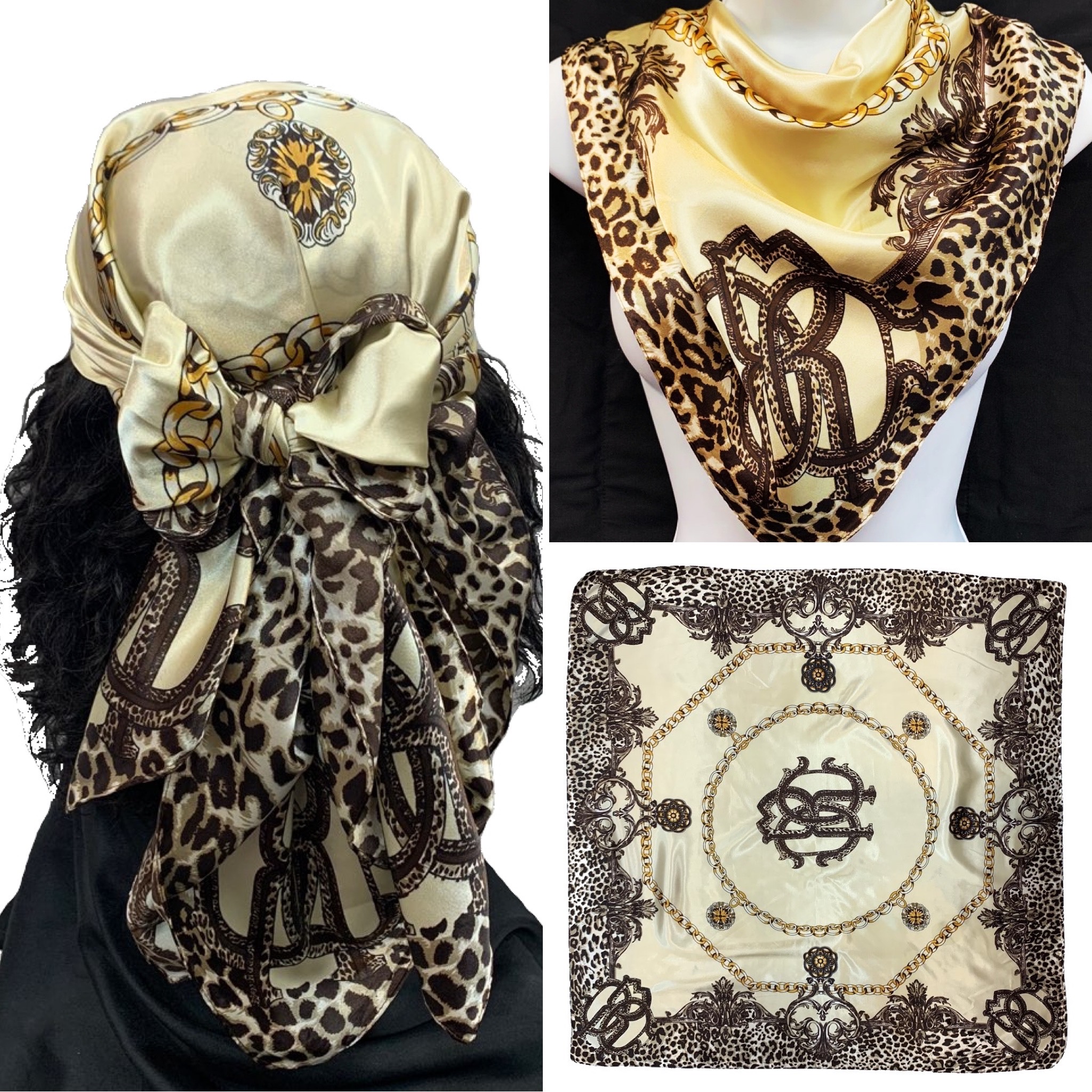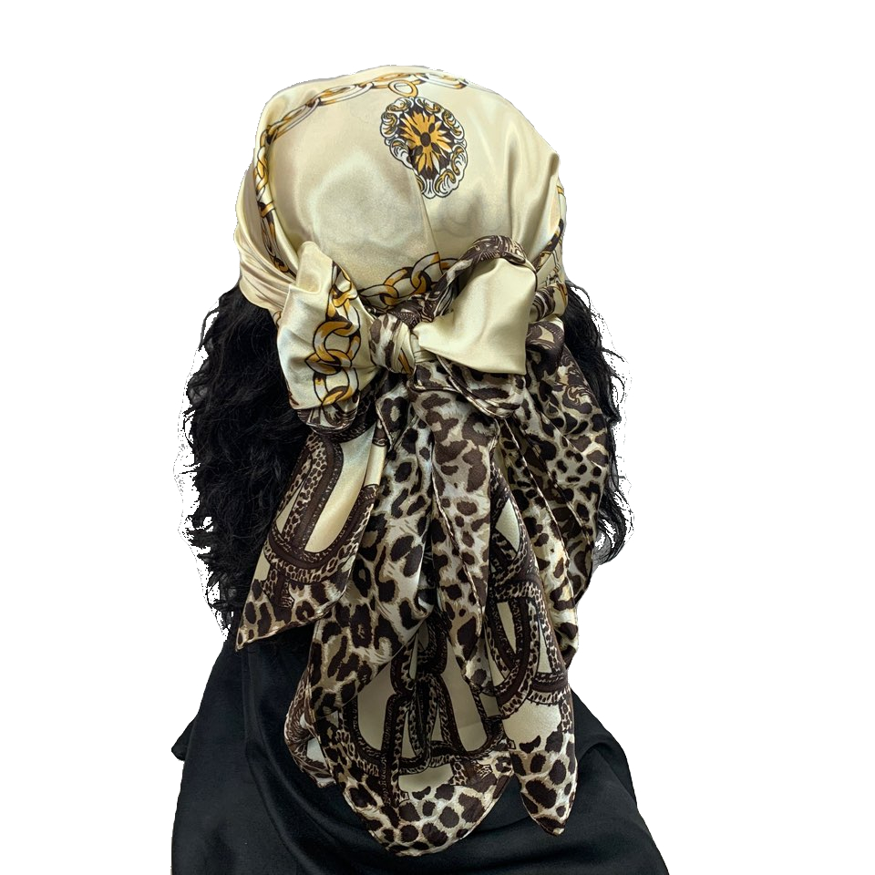 A luxurious multi-purpose satin scarf measuring 35" x 35", showcasing its soft texture and elegant design, perfect for fashion and hair styling.