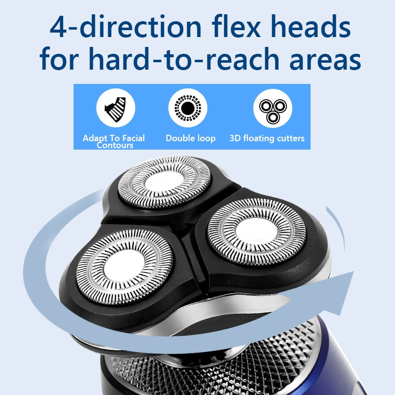 The Multi-function Electric Shaver features a rotary three-head double-ring independent floating blade system. This three-dimensional head structure adapts to the contours of your face, ensuring a close and comfortable shave every time. The independent floating blades work together to capture and cut hair effectively, reducing irritation and providing a smooth finish.
