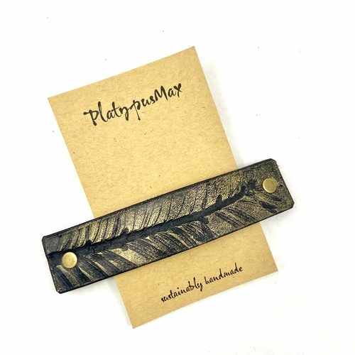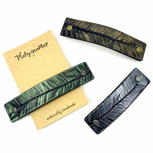 Our barrettes are not only aesthetically pleasing but also built to last. Each piece is crafted with care, ensuring quality craftsmanship that you can rely on. The clips are made from high-quality, sturdy French-style metal with a tension bar, providing a secure hold for all types of long or thick hair. The leather is securely attached to the clip using metal rivets, ensuring durability and longevity.
