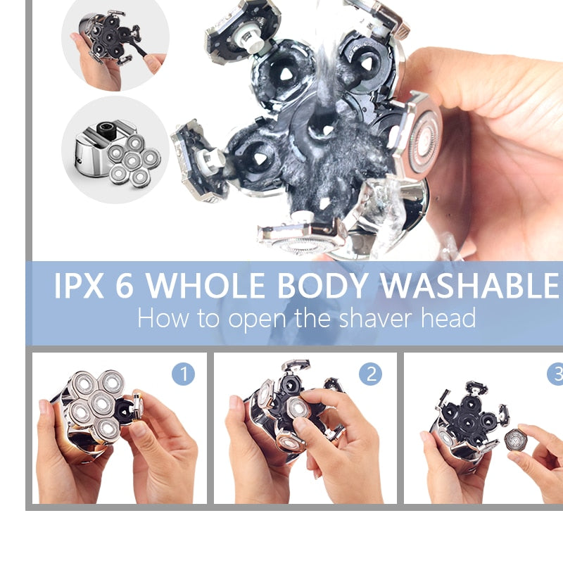 The New LCD Display Wet Dry Men Electric Shaver comes with a variety of attachments to cater to all your grooming needs. The package includes a precision trimmer, hair trimmer head, nose trimmer head, facial massage brush head, and a facial deep cleaning brush head. It also comes with three guide combs (3mm, 5mm, and 7mm) for customizable hair lengths.