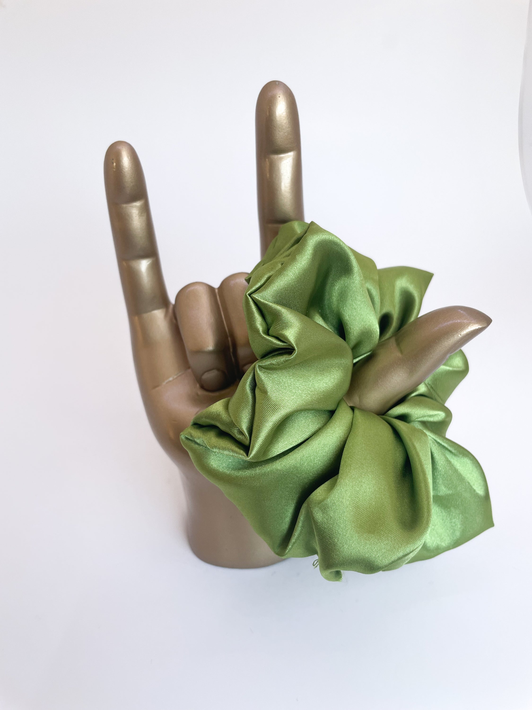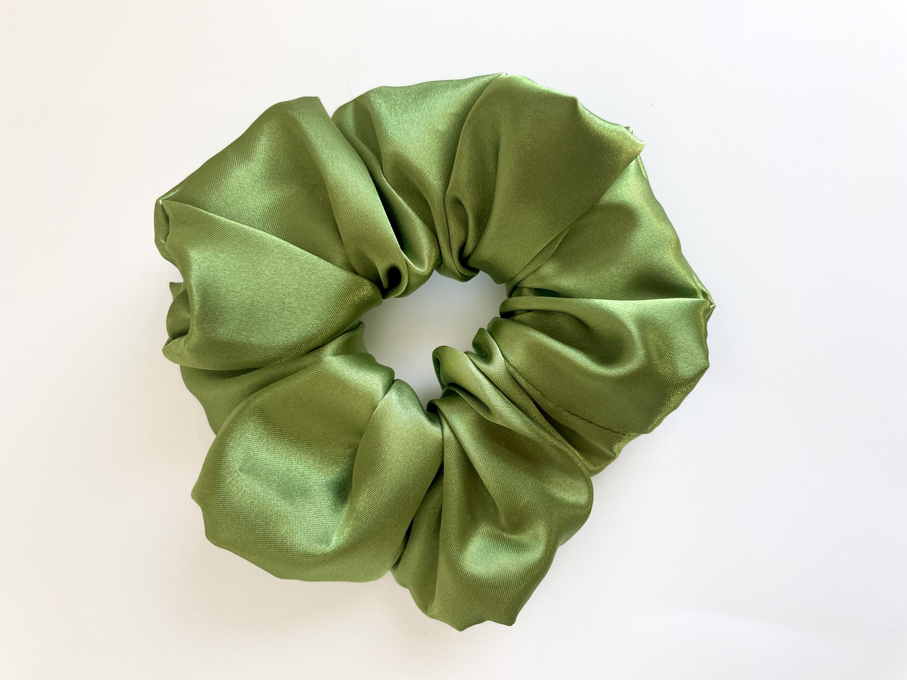 Olive satin scrunchie with a smooth texture, perfect for stylish hairstyles.
