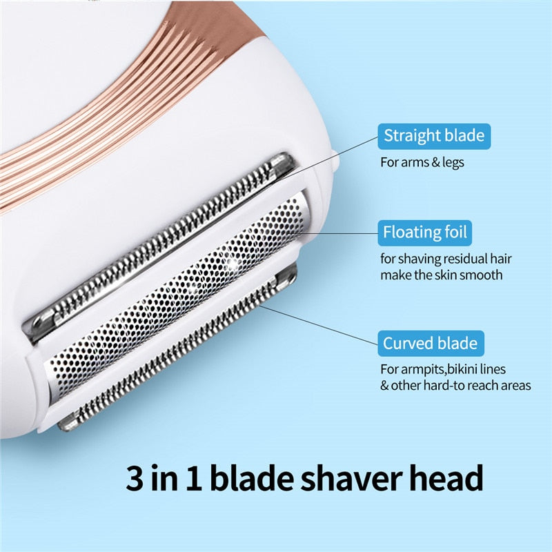 Portable Electric Hair Remover with three blades, designed for painless hair removal on various body parts, shown with USB charging cable.