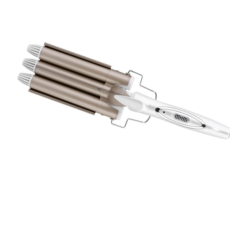 Professional 3 Barrels Big Wave Electric Hair Curlers in gold color, showcasing three barrels for creating beautiful waves.