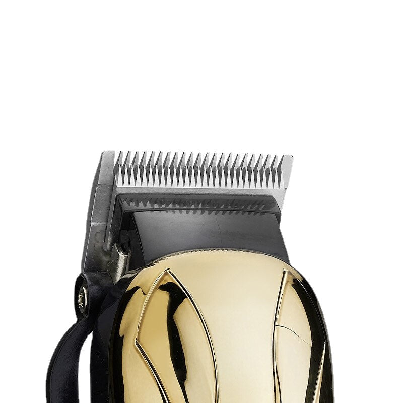 Professional hair clipper for barbers, featuring a sleek golden design, multiple limit combs, and a USB charging cable.
